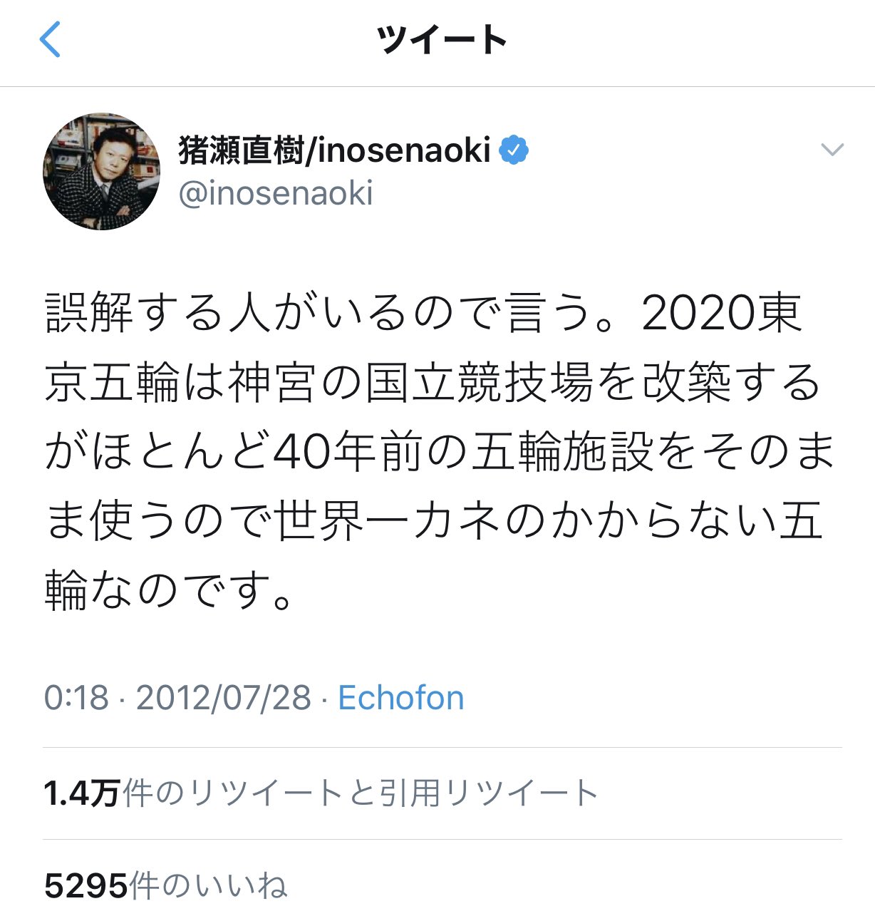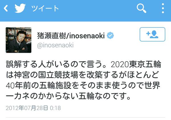 猪瀬直樹 Inosenaoki On Twitter 誤解する人がいるので言う 2020東京五輪は神宮の国立競技場を改築するがほとんど40年前の五輪施設をそのまま使うので世界一カネのかからない 五輪なのです